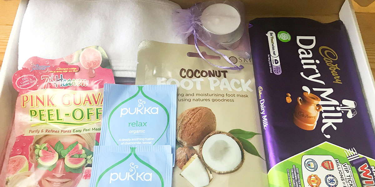 Pamper Box (Soothing Foot Mask, Face Mask, Headband 2 Relaxing Pukka Teabags, Large Chocolate Bar, 2 Fresh linen Tea Lights) – £15